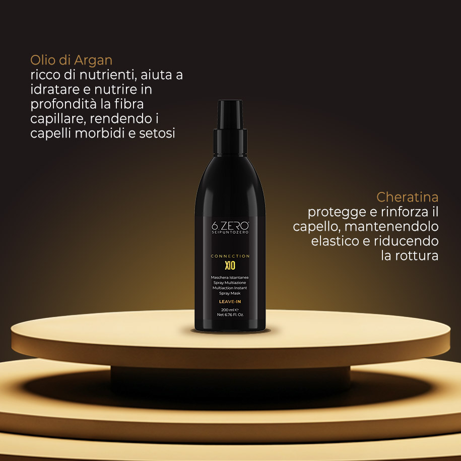 Connection X10 è la maschera spray senza risciacquo per una multi-azione istantanea che regala dieci incredibili benefici ai capelli: nutre, districa e ripara, previene le doppie punte, ha un effetto anti-crespo, dona texture, luminosità e morbidezza, protegge dal calore, facilita lo styling e ne prolunga la durata.